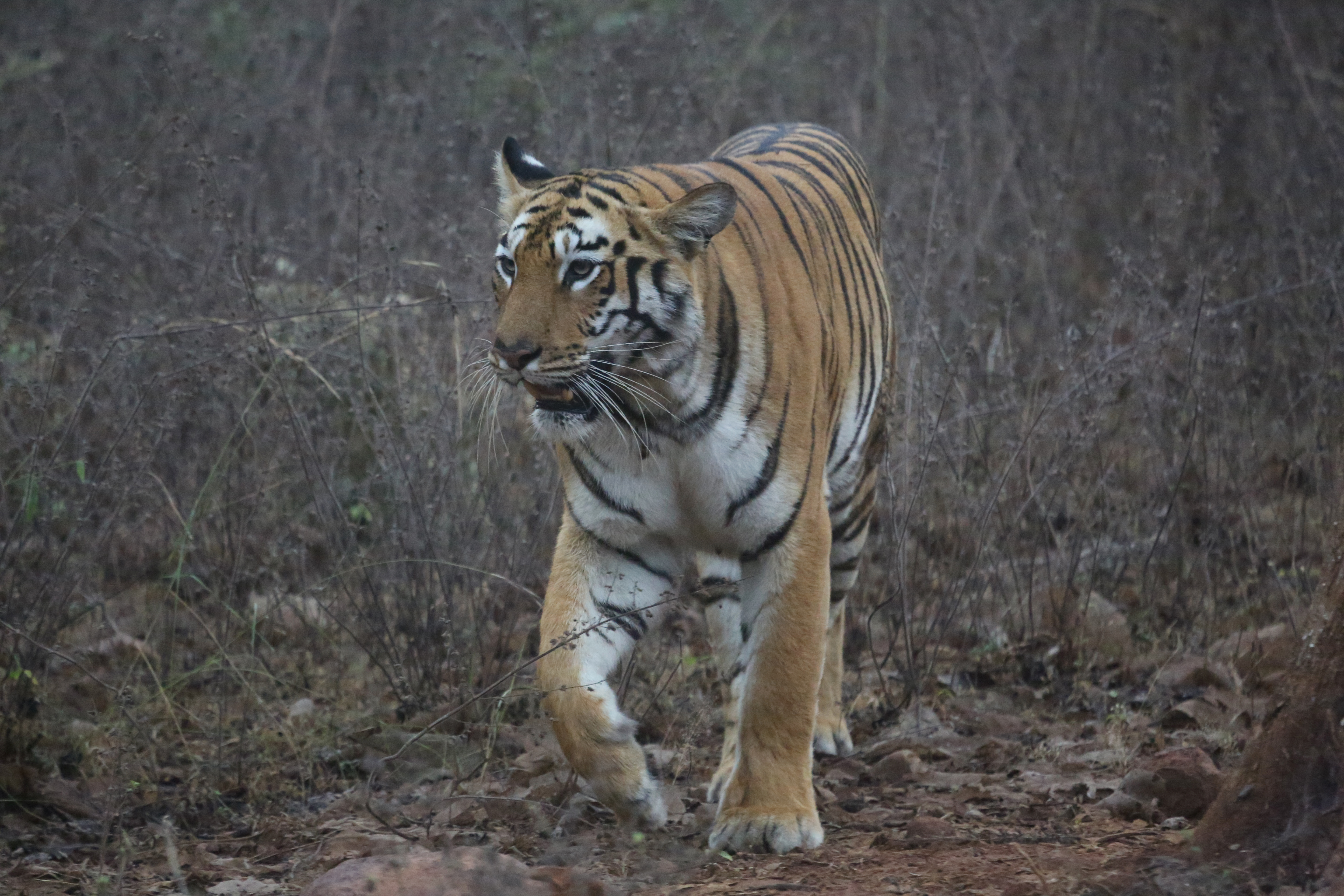 She approached our convoy from the left. Confidently & fearlessly walking towards us. Crossed the path between Gypsy no 1 and Gypsy No 2 of the convoy (we were in Gypsy No 1) and walked beside the road for a good kilometre or so alongside us, on the right. It was almost like she was posing, for us ‘simps’ / ‘stupid humans’ to bask in her glory!!! ๐ฏ๐๐ฏ